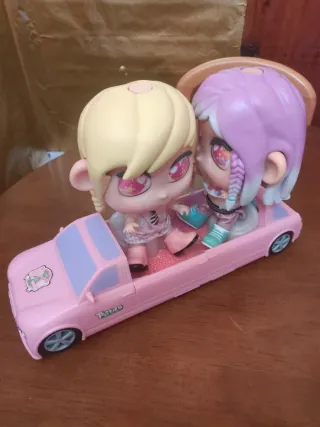 Set de muñecas Trotties Emma y Lucy con su limusina. Tienen ojos emojis,cambian hasta tres expresiones. -varios accesorios. - Incluye dos muñecas. - Limusina de color rosa.