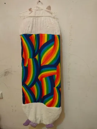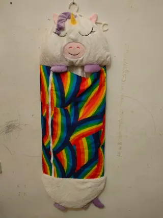 Saco de dormir infantil,con diseño de unicornio y estampado de arcoíris. - Parte superior con cara de unicornio. - Estampado de arcoíris vibrante. - Material suave y cómodo. - Mide 1.35 incluido la cabeza que es una pequeña almohada. - Calentito. Completamente nuevo.