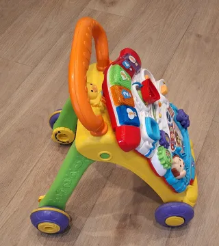 Correpasillos con diseño de Minnie Mouse, ideal para los más pequeños. - Color rosa y blanco. - Volante interactivo. - Empuñadura para empujar.