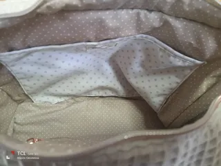 Bolso para carro de bebé con un diseño tejido waffe y piqué .Incluye un detalle de corazón colgante. - Tejido exterior tipo gofre. - Compartimento frontal con estampado de topos. - Cierre de cremallera. - Asas de mano y correa ajustable. - Detalle de botones de madera con inscripción 'handmade'.