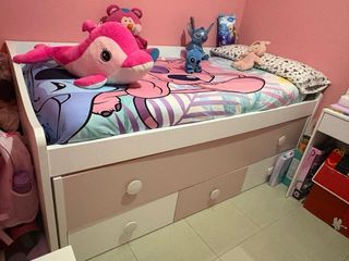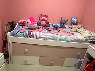 Cama nido con un diseño moderno y funcional, ideal para habitaciones infantiles o juveniles. Cuenta con espacio de almacenamiento adicional. - Estructura de madera blanca y frentes de cajón en tono rosa palo. - Tres cajones amplios en la parte inferior. - Tiradores redondos blancos. -No envio a recoger en domicilio -Precio negociable