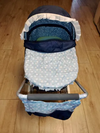 Cochecito de muñecas clásico en color azul y blanco. - Reversible y plegable - Capota ajustable. - Interior forrado con tela estampada. - Ruedas grandes. - Cesta inferior. - Asa para empujar. - Incluye bolso a juego.