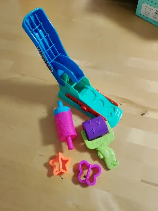 Set de moldes y herramientas para plastilina. - Incluye extrusora tipo grapadora. - Rodillo con diseño de huellas. - Cortadores con formas de estrella y mariposa. - Extrusora con forma de botella.