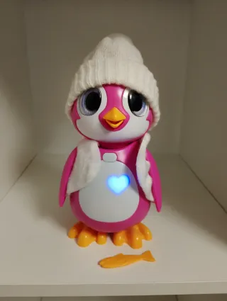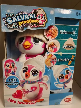 Juguete interactivo Salva al Pingüino con sonidos y movimientos. - Incluye más de 20 movimientos y sonidos reales. - El pingüino es de color rosa con un gorro blanco y bufanda. - Viene con un corazón rojo brillante.