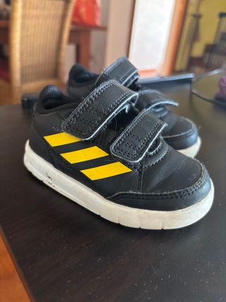 Zapatos deportivos Adidas para bebé en color negro con detalles en amarillo. Talla 20