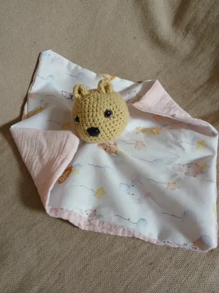 Doudou para bebé hecho con dos telas: 100% algodón y muselina. Es suave y perfecto para los más pequeños. - Composición: 100% algodón y muselina. - Diseño con estampado infantil. - Cabecita de ositos tejido todo a mano a ganchillo, con hilo de algodón, ojos y nariz de seguridad, relleno hipoalergénico.