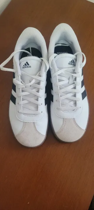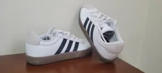 Zapatillas Adidas VL Court 3.0 en color blanco. Talla 38 Usadas solo una vez. - Diseño clásico con las tres rayas. - Detalle en ante en el talón y puntera. - Suela de goma marrón.
