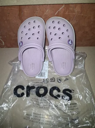 Zuecos Crocs en color lavanda, talla 8 (equivalente a 25-26). - Diseño clásico con agujeros. - Logo de Crocs en los laterales. Usadas para ir por casa. Aún pueden tener mucha vida.