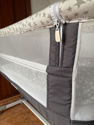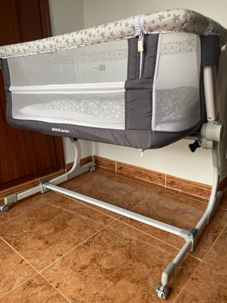 Cuna de colecho marca Jane, modelo Babyside. Diseñada para colocar junto a la cama. - Estructura de metal. - Laterales de malla transpirable. - Incluye colchón con 2 fundas blancas. - Incluye un pequeño nórdico. - Incluye su pequeño cojín. - Incluye su saquito para envolver el bebe. - Ruedas para facilitar el movimiento. - se vende sin el embalaje original.