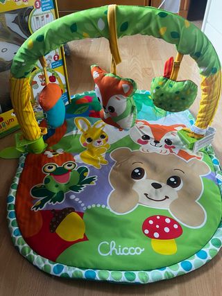 Manta de juegos para bebé de la marca Chicco, con un diseño de bosque y animales. - Incluye arco de juegos con varios peluches colgantes. - Diseño colorido con animales como un oso, un zorro y una rana. - Base acolchada para mayor comodidad del bebé.