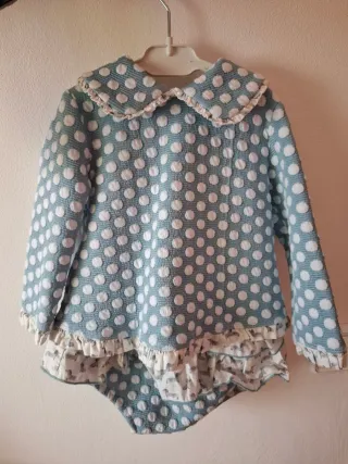 Conjunto de bebé de 36 meses, completamente nuevo. - Diseño de lunares en azul y blanco. Y perros salchicha (en cuello). - Cuello con volante. - Braguita con estampado de perros salchicha y volantes.