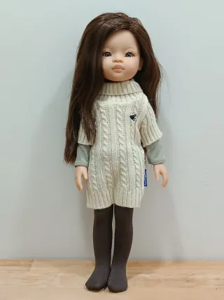 Muñeca con un bonito vestido de punto color crema y leotardos marrones - Vestido de punto con cuello alto y trenzado. - Manga larga gris debajo del vestido. - Leotardos marrones. - Pelo largo castaño y ojos azules.