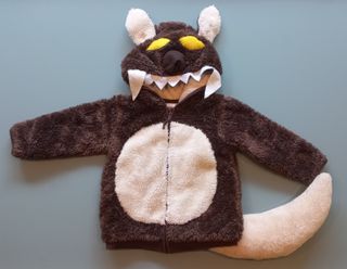 Disfraz de lobo compuesto por: - Chaqueta marrón de pelo con cremallera y capucha de H&M de la talla 12-18 meses, a la cual se le añadió tela también de pelo para hacer la barriga y una cola con relleno de conjunto de color más claro, unos ojos, una nariz y dientes en la capucha. - Pantalón marrón hecho a medida. Mucha más ropa y otras cosas de bebé en mi perfil.