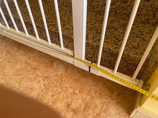 Barrera de seguridad blanca para escaleras o pasillos. - Ajustable entre 75 asta 105 cm. - Altura de 77 cm. - Ancho de la extensión: 30 cm. - Espacio entre barrotes: 5.5 cm.