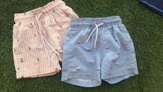 Conjunto de dos bañadores para niño, perfectos para el verano. 6 años kiabi - Bañador azul con estampado de veleros. - Bañador a rayas amarillas con estampado de palmeras.