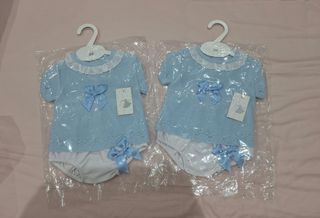 Conjunto de dos ranitas de bebé de la marca TEX. 3-6 meses - Color blanco roto con detalles en azul claro. - Tejido texturizado. - Lazos decorativos en los hombros.