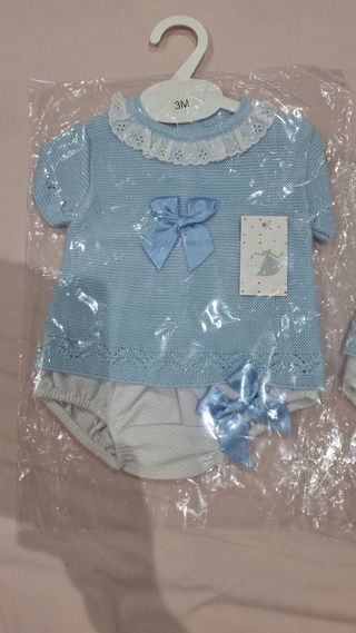 Conjunto de ranita azul para bebé de 3 meses. - Tejido de punto. - Cuello con puntilla. - Lazos decorativos.