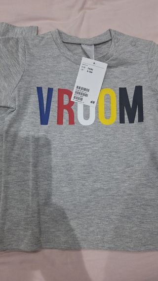 Lote de dos camisetas grises de manga corta con el texto VROOM en letras de colores. - Marca: H&M - Talla: 74/80 (6-12 meses) - Diseño divertido y llamativo.