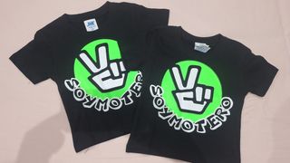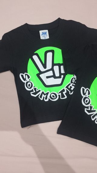 Camiseta negra con un llamativo estampado frontal. 2años - Diseño Soy Motero con símbolo de la paz. - Color del estampado: verde lima y blanco.