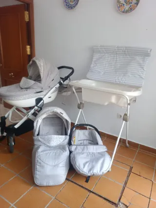 Conjunto de cochecito de bebé en color gris, ideal para los primeros años. Incluye bañera, cambiador y mosquitera - Capazo espacioso. - Silla de paseo. - Silla de coche grupo 0. - Incluye accesorios.