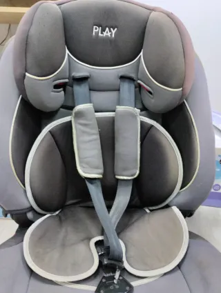 Silla de coche para bebé de la marca PLAY, con un diseño acolchado para mayor comodidad. - Tapicería en tonos grises y negros. - Sistema de arnés de seguridad. - Reposacabezas ajustable.