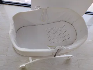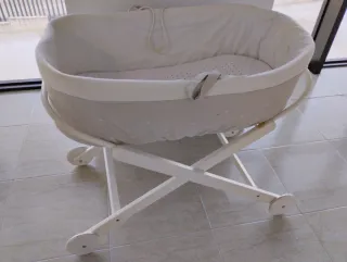 Capazo para bebé con un diseño moderno y práctico. Incluye ruedas para facilitar su movilidad y un soporte para mantenerlo estable. - Tejido exterior con estampado de estrellas. - Interior acolchado y suave. - Ruedas para transporte.