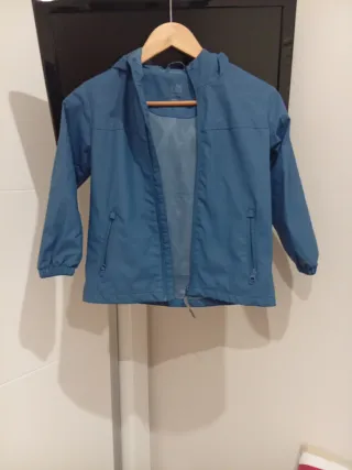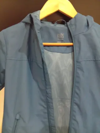 Chubasquero azul para niño, talla 6. Ideal para días de lluvia. - Capucha integrada. - Cierre de cremallera. - Bolsillos laterales con cremallera. - Puños elásticos.