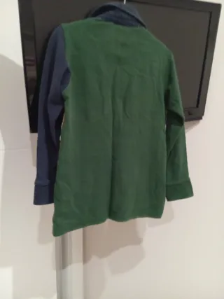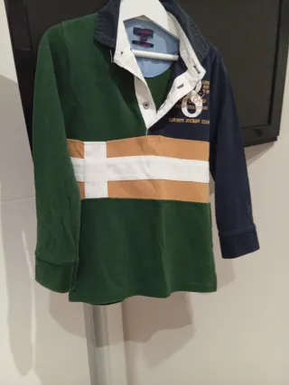Polo de manga larga para niño, talla 5. Diseño a bloques de color con detalles de rayas. - Cuello tipo polo con botones. - Mangas largas. - Combinación de colores verde, marrón y azul marino.