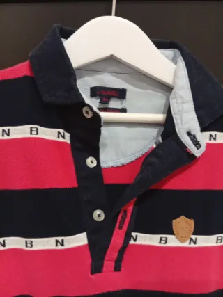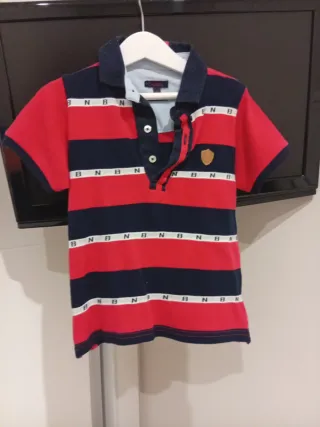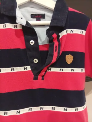 Polo de manga corta para niño, ideal para el día a día. - Diseño a rayas rojas y azul marino. - Cuello tipo polo con botones. - Detalle de escudo en el pecho. - Logo BNB repetido en las franjas blancas.