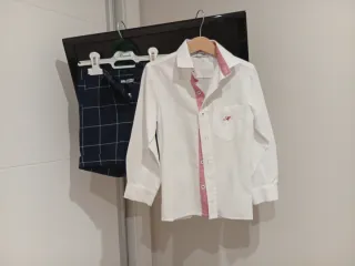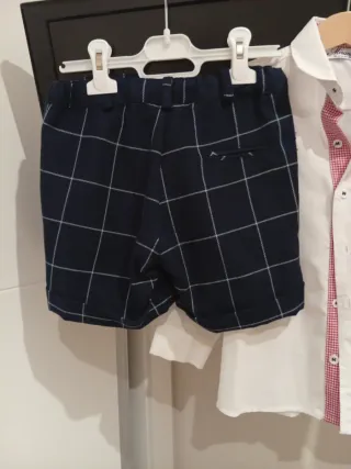 Conjunto de dos piezas para niño, talla 5. Incluye camisa blanca y pantalón a cuadros. - Camisa blanca de manga larga con detalles a cuadros en cuello y puños. - Pantalón corto azul marino con estampado de cuadros blancos.