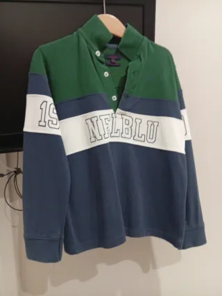Polo de manga larga para niño, talla 5 años. Diseño a rayas con cuello y tapeta de botones. - Color verde, blanco y azul marino. - Logo de la marca en el pecho. - Número 19 en la manga izquierda. - Texto NELBLU en el pecho.