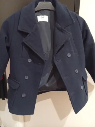 Abrigo azul marino para niño, talla 5 años. Un clásico que no pasa de moda. - Diseño de doble botonadura. - Cuello solapa. - Bolsillos frontales.