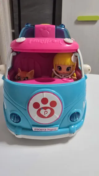 Ambulancia de Pinypon para el cuidado de mascotas. Incluye figuras y accesorios. Diseño de ambulancia en color azul y rosa. En perfecto estado, sin caja original.