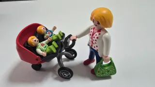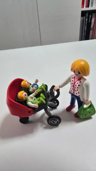 Set de Playmobil que incluye una figura de mamá con sus dos bebés en un cochecito doble. En perfecto estado. Sin caja original.
