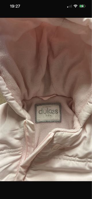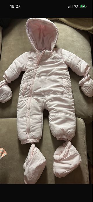 Buzo de invierno para bebé niña de la marca Dulces. - Talla 3-6 meses. - Color rosa pálido. - Incluye gorro, manoplas y patucos. - Diseño acolchado.
