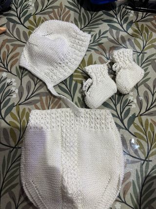 Conjunto de ropa para bebé, tejido a mano con gran detalle. - Incluye gorrito, patucos y polainas. - Color blanco. - Diseño delicado con puntillas. Puedes encargarlo del color y la talla que necesites. Se hacen a mano y por encargo. 655526951