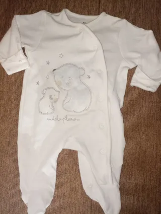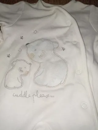Pijama de una pieza para bebé, con un peso recomendado de 3 a 4 kilos. Es de manga larga y tiene pies. - Color blanco. - Estampado de ositos y estrellas. - Cierre con botones a presión.