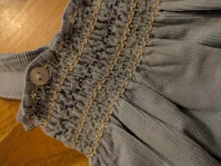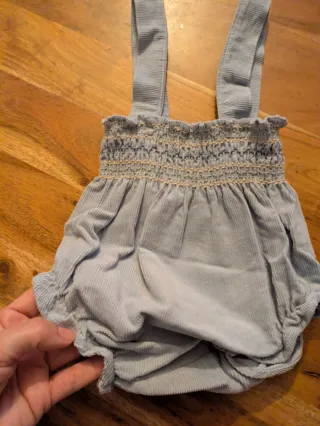 Ranita para bebé confeccionada en micro pana de algodob. Tirantes con abrochado individual. Fruncido en panel de abeja. Prácticamente nuevo. Una puesta.