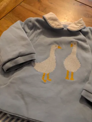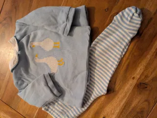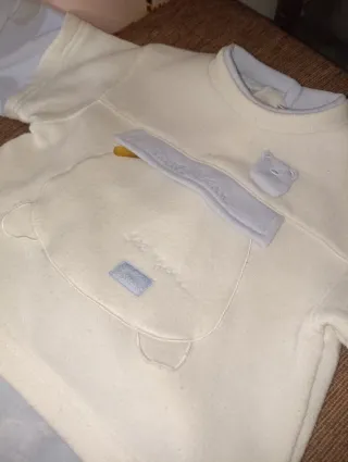 Conjunto bebe marca COCONUT. 100% Algodón. Totalmente nuevo. Consta de dos piezas: suéter abotonado en la parte delantera y acabado en cuello camisero color blanco. Polaina a rayas celeste y blanco con pie incorporados. Precio original de compra 40€. Prácticamente nuevo