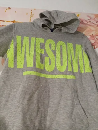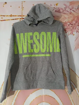 Sudadera gris con capucha y estampado Awesome en color verde neón. Ideal para el día a día. - Talla 10 años. - Diseño con bolsillo frontal.