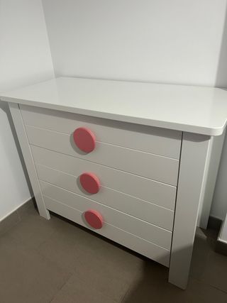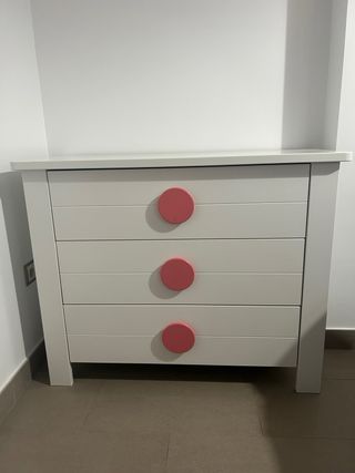 Cómoda infantil de madera en color blanco, ideal para habitaciones de niños. - Tres cajones con tiradores redondos en color rosa. - Diseño moderno y funcional. Medidas: 110x88x49
