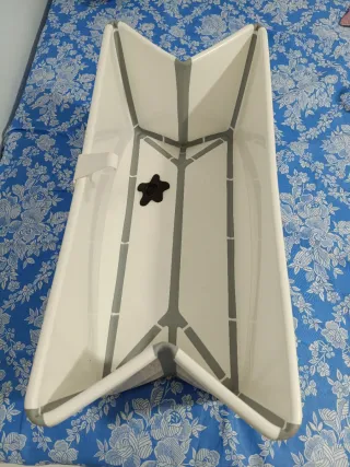 Bañera plegable de la marca Stokke, diseñada para facilitar el baño del bebé. - Diseño blanco con detalles en gris. - Plegable para un fácil almacenamiento.