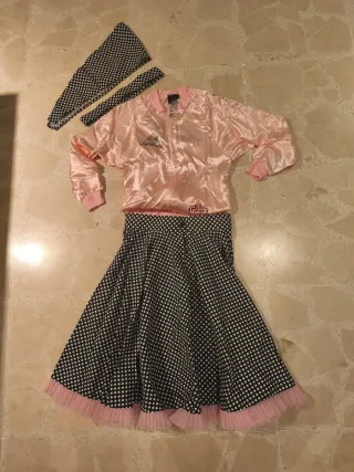 Conjunto de disfraz inspirado en Grease para niña. - Chaqueta Pink Ladies rosa con cremallera. Talla 7-9 - Falda negra con lunares blancos y volantes rosas. ( Hecha a mano) - Pañuelo y cinta pelo a juego con lunares.