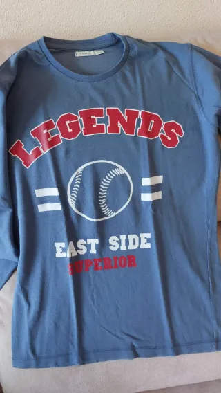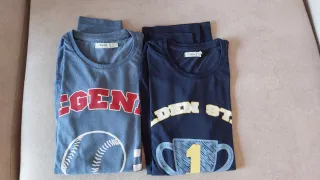 Lote de dos camisetas para niño de 11 años de la marca Sfera. Una es azul con un diseño de béisbol y la otra es azul marino con un trofeo. - Camiseta azul con texto LEGEND y dibujo de pelota de béisbol. - Camiseta azul marino con texto GOLDEN STATE y dibujo de trofeo con el número 1.
