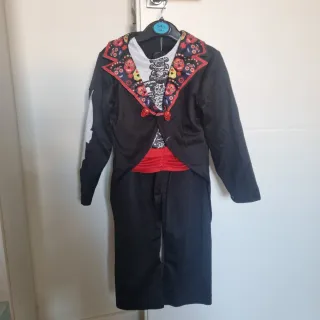 Disfraz de calavera mexicana para niño, ideal para fiestas temáticas o Halloween. Incluye chaqueta, pantalón y fajín. - Diseño inspirado en el Día de Muertos. - Chaqueta negra con detalles coloridos en el cuello. - Pantalón negro. -Sombrero - Fajín rojo. - Talla 3-4 años (104 cm).