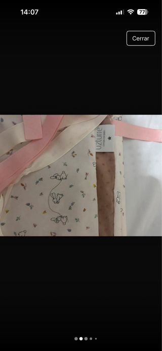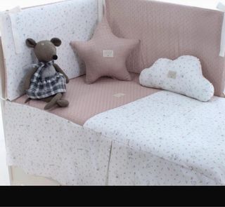 Conjunto de ropa de cama para cuna de la marca Uzturre, con un diseño infantil. - Sábana encimera y funda almohada - chichonera con relleno - Funda nórdica y relleno nórdico - cojines decorativos - Estampado de pequeños topos y motivos infantiles. Solo la sabana y la funda costaron 160. Los cojines 24 cda uno se vende teoos por 85 euros Solo se ha usado la chichonera