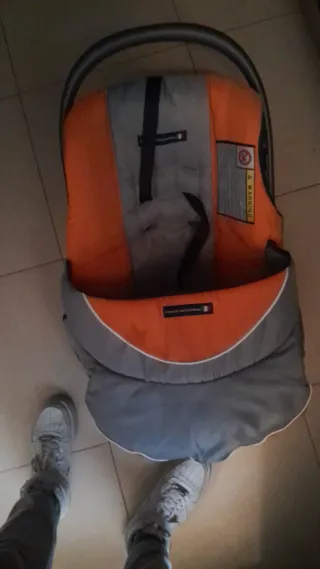 Silla de paseo ligera y práctica para bebés. Ideal para desplazamientos diarios. - Diseño en color naranja y gris. - Barra frontal acolchada. - Ruedas para facilitar el movimiento. Tiene capota para la lluvia Silla coche incluida
