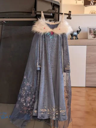 Precioso disfraz inspirado en Elsa de Frozen, ideal para fiestas o para jugar. - Vestido largo de terciopelo azul. - Detalle de cuello de pelo blanco y pedrería. - Mangas largas con adornos dorados. - Capa de tul con copos de nieve plateados.
