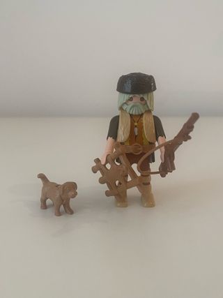 Figura de Playmobil de un cazador/ trampero con su perro y rifle. Tiene una pequeña rotura en el cinturón (última foto) pero no afecta a la figura ya que es casi imperceptible y el cinturón no se cae. Por lo demás está impoluto, nunca se ha usado. Precio no negociable.