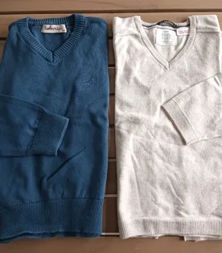 Lote de dos jerséis de punto con cuello pico para niño. Jersey azul tinta con detalle bordado de la marca hormiga 4A Jersey beige liso de Zara 2/3A Valen para la misma edad, aunque tengan tallas distintas.Cada marca tiene sus propios patrones .